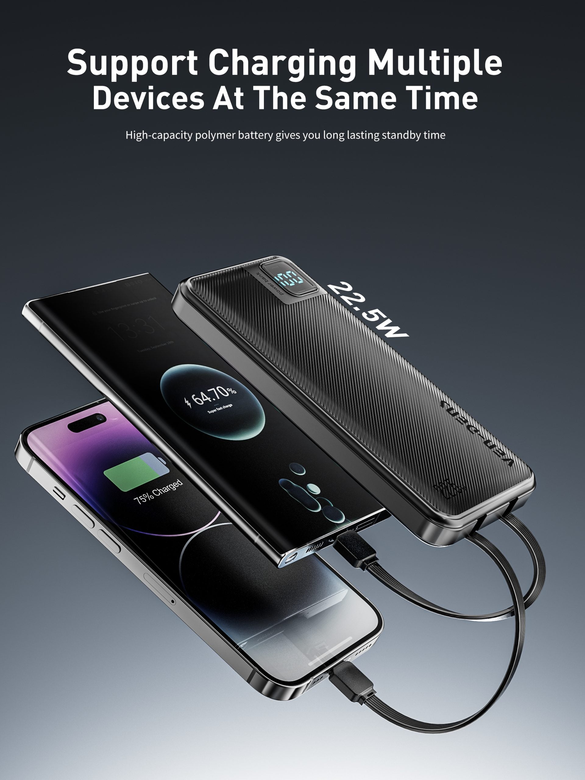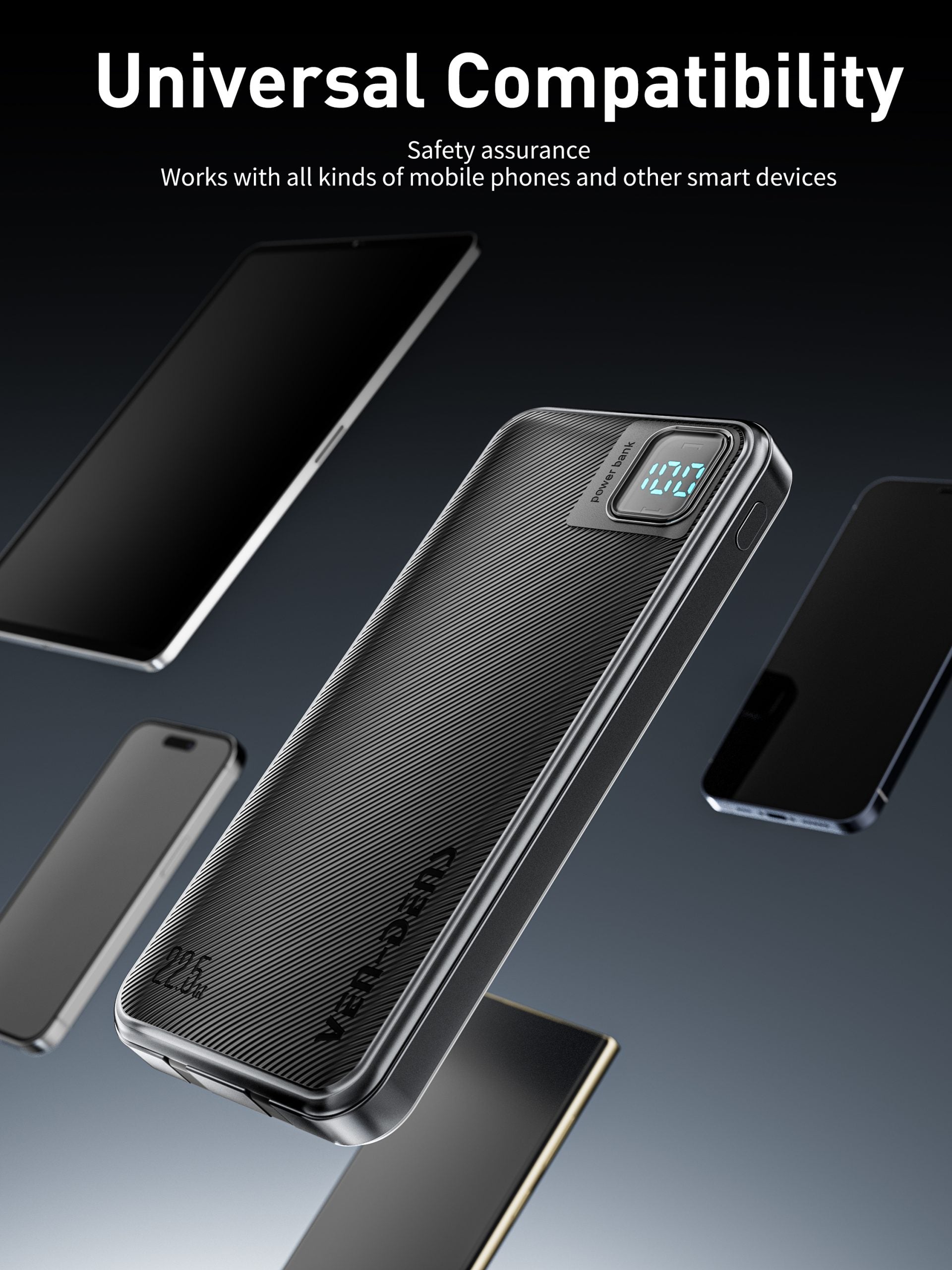 VD-PB060 Toptan fiyatla, telefonlar için Type-C/IP kablolu, dijital ekranlı, yüksek kaliteli 10000mAh Power Bank.